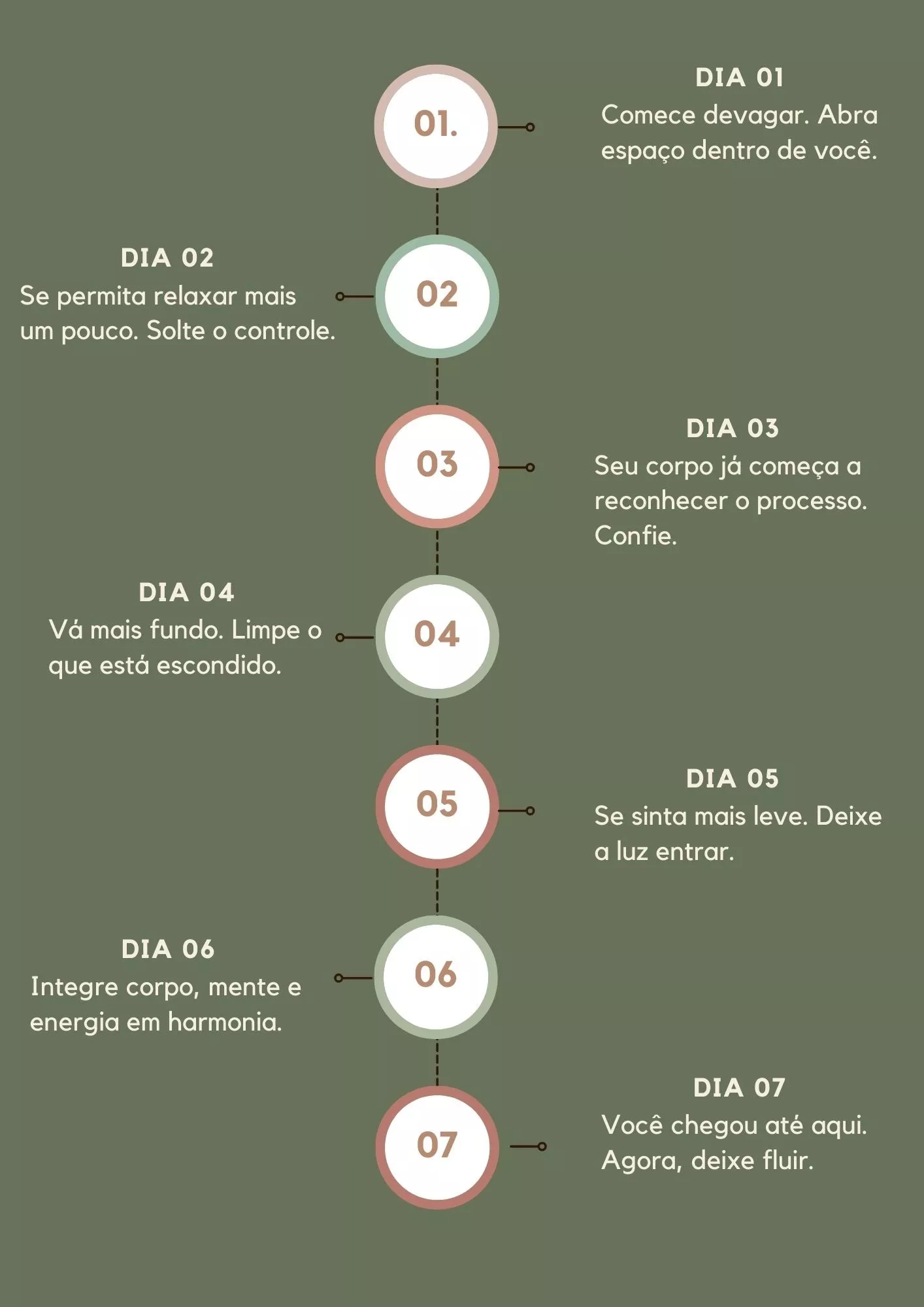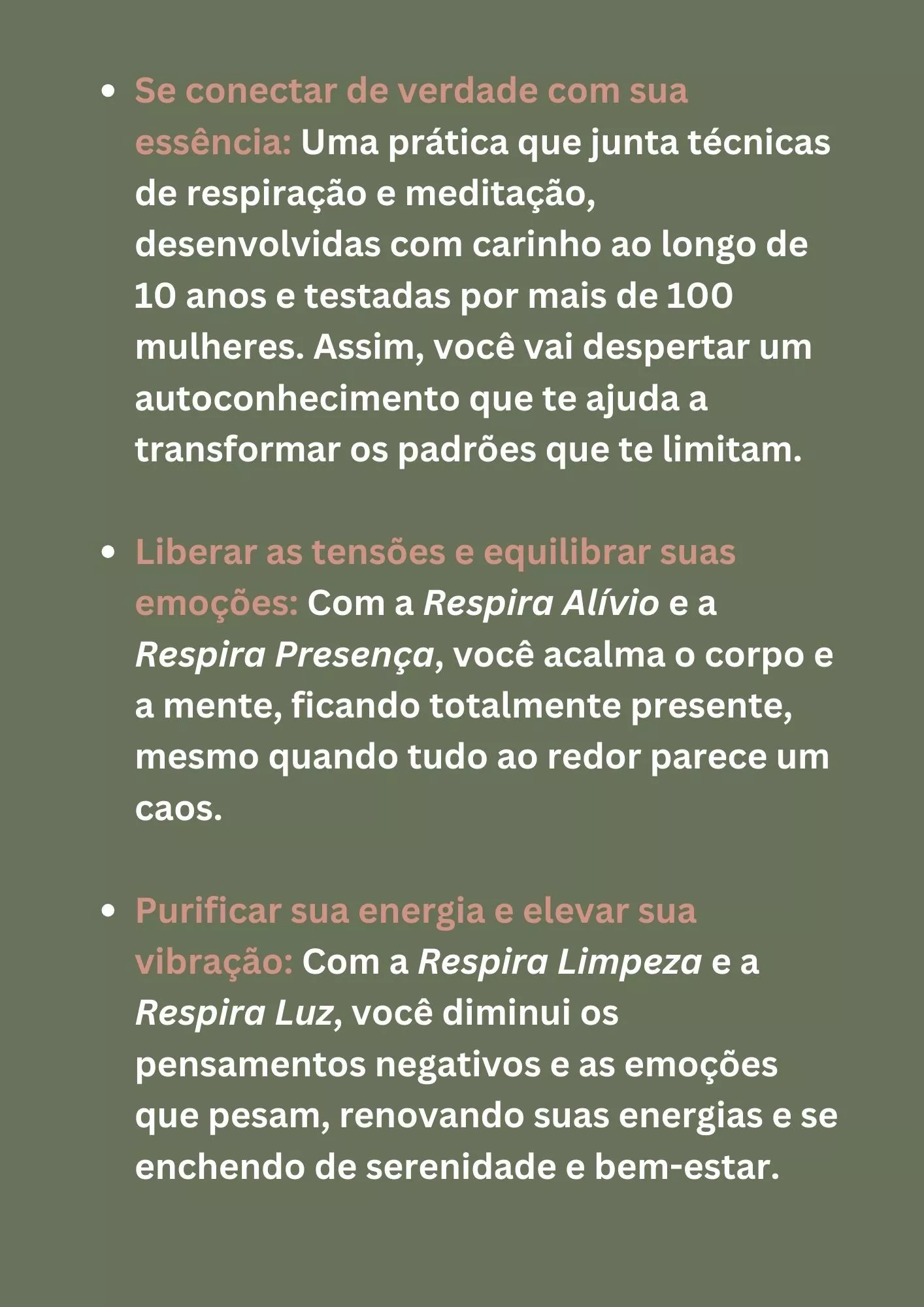É um método prático que junta técnicas de respiração consciente, meditação guiada, escrita intuitiva e frequências sonoras. Em poucos minutos diários, ele te ajuda a se reconectar com sua essência, reduzir a ansiedade e equilibrar suas emoções.